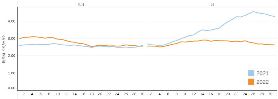 从价格走势看,旬均价先涨后降。10月2—6日我国大部地区受寒潮影响,出现明显降温,河北、辽宁、内蒙古、山东等多地最低气温跌破1961年以来同期历史低值,蔬菜产量下降、价格上升,10月上旬末地头价2.79元/公斤,比月初2.56元/公斤上涨9.0%。中旬总体平稳,维持在2.82—2.90元/公斤。10月下旬温度适宜,大量秋菜集中上市,蔬菜地头价持续走低,月末地头价比月内最高点下降9.3%。