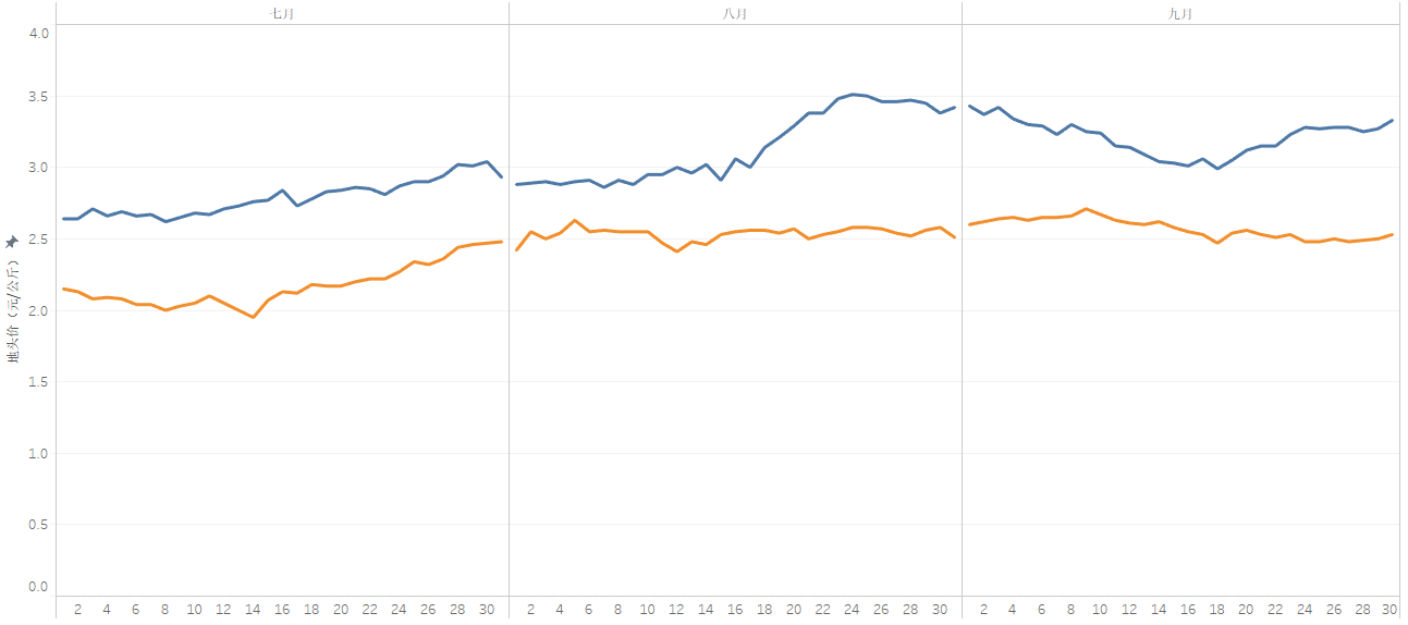 从平均价格看,呈现3个特点。一是同比下跌。去年南方夏季灾害性天气发生频率高、持续时间长、影响范围广,叠加疫情影响因素,蔬菜供应量减少,价格偏高,今年夏季无大面积严重气象灾害,蔬菜供需关系相对宽松,平均地头价同比下跌19.6%。二是环比略有上升。9月份仍属于夏秋蔬菜产销淡季,加上今年南方多地气温较常年同期明显偏高、高温日数明显偏多,蔬菜地头价维持高位运行,环比略有上升。三是月内价格平稳。9月平均地头价最高为2.71元/公斤,最低为2.47元/公斤,波动幅度为9.7%,价位运行继续保持基本稳定。