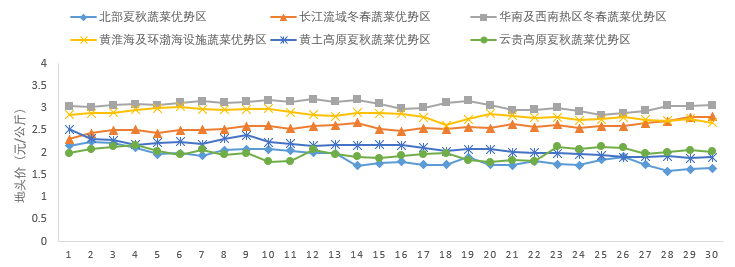 从区域布局看,蔬菜地头价环比呈南升北降格局。9月份,江南中南部、华南中北部等地高温日数,较常年同期普遍偏多3~10天,部分地区偏多10天以上,南方主产区地头价环比上升。华南及西南热区冬春蔬菜优势区月均价3.06元/公斤,环比上升9.7%;长江流域冬春蔬菜优势区月均价2.56元/公斤,环比上升9.9%;云贵高原夏秋蔬菜优势区月均价2.01元/公斤,环比上升6.9%。北方主产区气候总体正常,当前夏秋蔬菜优势区正值上市高峰期,地头价环比下降。黄淮海与环渤海设施蔬菜优势区月均价2.85元/公斤,环比下降0.7%;黄土高原夏秋蔬菜优势区月均价2.12元/公斤,环比下降2.3%;北部夏秋蔬菜优势区月均价1.90元/公斤,环比下降19.8%。