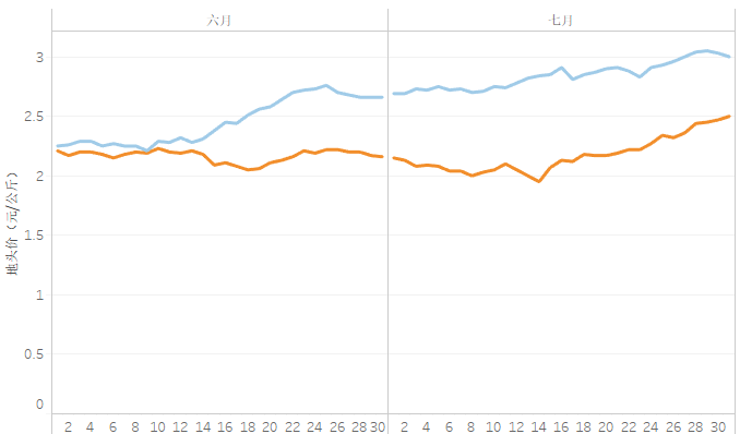 从区域布局看。夏秋蔬菜优势区平均地头价环比降幅超过10%。北部夏秋蔬菜优势区、黄土高原夏秋蔬菜优势区、云贵高原夏秋蔬菜优势区是当前蔬菜产品的主要供应区,这三个区域7月份的蔬菜上市量加大,平均地头价环比降幅分别为16.9%、11.0%和10.5%。设施蔬菜平均地头价环比上升。主要是因为黄淮海与环渤海设施蔬菜优势区受暴雨和持续阴雨寡照影响相对较大。长江流域冬春蔬菜优势区环比下降。一是因为4月阴雨天气使得部分露地蔬菜移栽延后,7月份集中上市,拉动价格下降;二是因为7月高温暴雨等异常天气较常年偏多,影响了蔬菜收获品质。